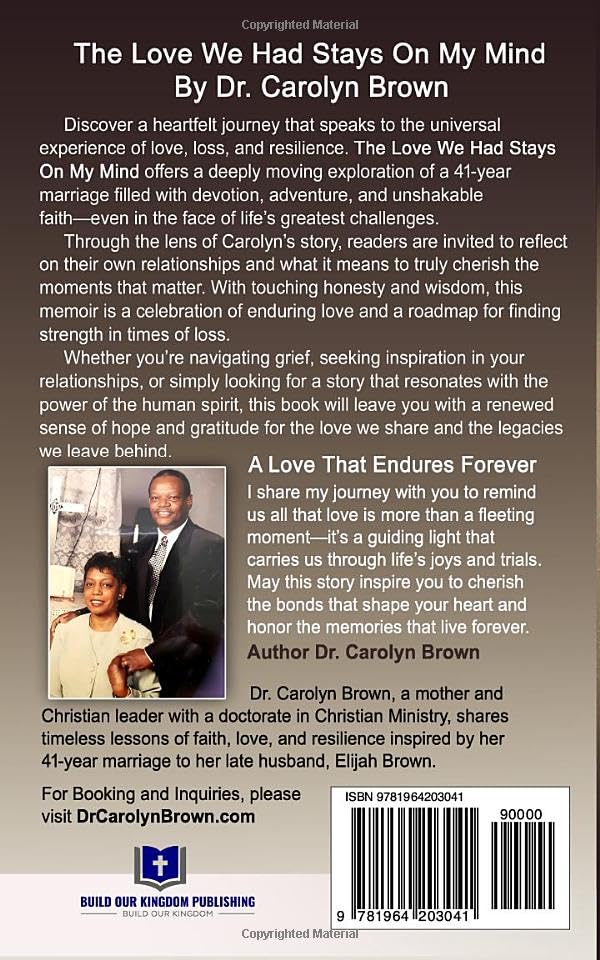 In The Love We Had Stays on My Mind, Dr. Carolyn Brown shares an extraordinary journey of faith, resilience, and enduring love as she reflects on her 41-year marriage to her late husband, Elijah. From their serendipitous first meeting to the foundation they built together, Carolyn offers readers a rare glimpse into a love story that weathered life’s greatest storms while blossoming in faith and devotion.