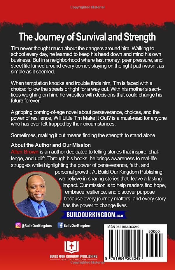 Will Little Tim Make It Out? is a gripping coming-of-age novel that follows the journey of a young boy trying to navigate the dangers of his neighborhood while holding on to his dreams of a better future.